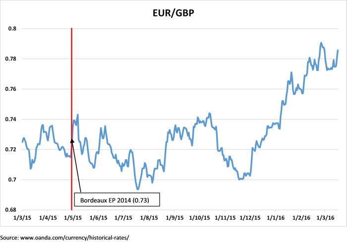 The impact of Brexit on UK consumers is even more complex in the event of a ‘yes’ vote. Continuing on the topic of exchange rates, the pound is likely to continue to weaken in the event of a Brexit. Deutsche Bank reported in February 2016 that ‘a UK exit from the EU is likely to negatively impact sterling and may see our existing forecasts of EUR/GBP 0.82 by the end of 2019 front-loaded’. Another bank I spoke to expects the pound to weaken sharply by 10-15% in the event of a Brexit vote, which would push the pound more towards 0.90. So the cost of wine from the EU is going to continue to rise for UK wine drinkers (along with my aforementioned brownie points).