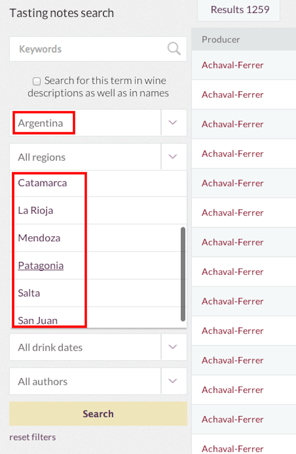 Also within tasting notes, menu items are now faceted – that is, dropdown menus are automatically filtered. So, for example, if you select Argentina from the country menu, the appellations from which you can choose are exclusively Argentine appellations. And so on.