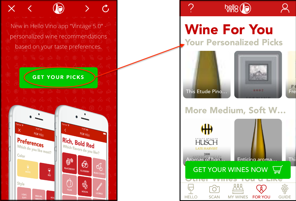 HelloVino asks you to specify your preferences from a list of styles and flavours, and it will then identify wines that are perfect matches for your palate. As you can see from the right-hand screengrab below, it uses a jumble of blurry images and truncated text to entice you to click and find out more.
