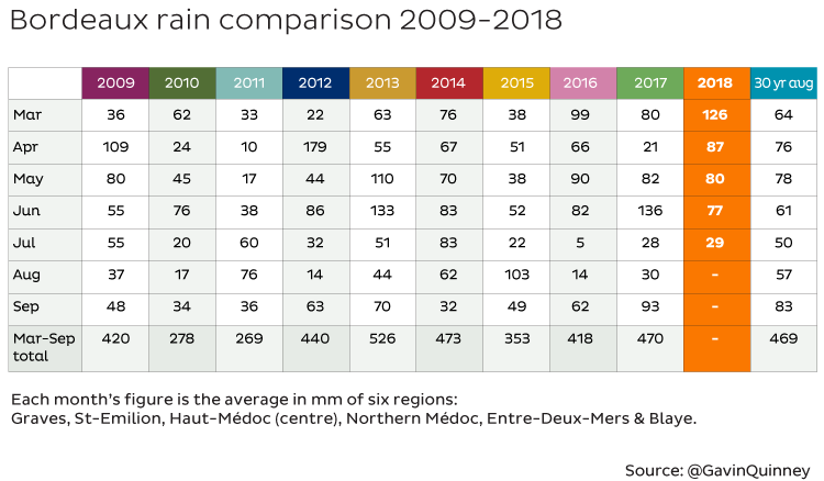 March rain was well above average, so, on top of the winter rain, we might have had plenty of water in reserve but we also had soggy vineyards that were hard to access by tractor for maintenance work and for spraying when the time came. The vines kick into life with bud break in April, and April, May and June saw rainfall at slightly higher levels than the average, but nothing untoward once summer kicked in after mid June. Just look at the comparable months of 2016, and most of us in Bordeaux would be happy if we ended up with a season and the resulting wine like that. That year, I recall, we had a drought from 23 June to 13 September. (Here at Bauduc we’ve had 360 mm/14 in of rain from March to July in 2018, with almost a third of that handily back in March, compared with the combined Bordeaux 2016 figure in the grid of 342 mm/13.5 in.)