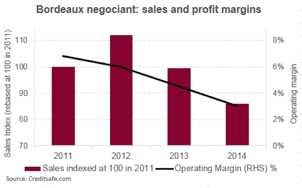 But Liv-ex’s charts show that profitability has plummeted both for Bordeaux négociants and for those who buy from them. Bordeaux négociants’ stocks grew from 246 to 305 days between 2013 and 2014 while their operating margins fell from 7% in 2011 to 3% in 2014. The UK fine-wine trade, which, with their French counterparts, constitute by far the most important buyers of bordeaux en primeur, has seen operating margins fall almost exactly in parallel, even though they keep much less stock.