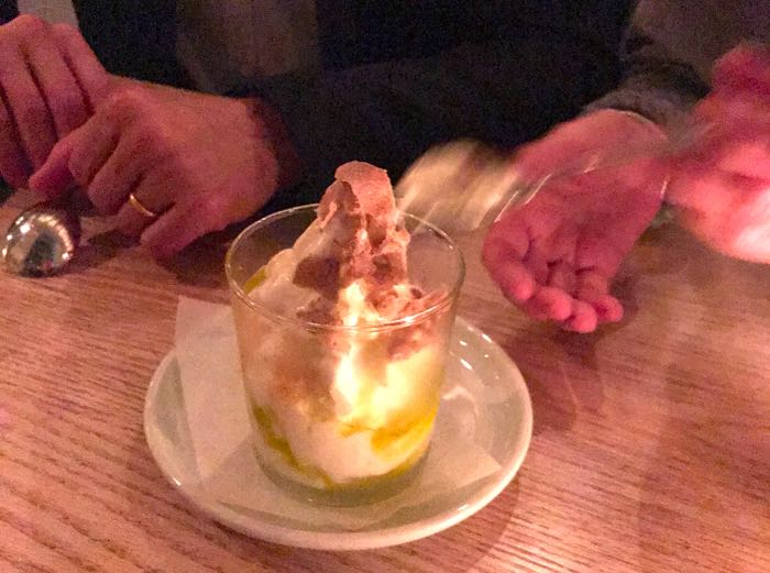 By the end of my second night I would have had one very strong candidate to add to my list. It was dessert at Lilia, in the Williamsburg suburb of Brooklyn, and it was remarkably simple. It was served in a glass that contained a mouth-watering amalgam of soft vanilla ice cream, extra virgin olive oil, sea salt and honey, on to which, for a further $25, the restaurateur, Sean Feeney, generously shaved a one-gram portion of white truffles from Italy. The combination was visually appealing and one that had all four of us reaching for our spoons, which we then licked clean.