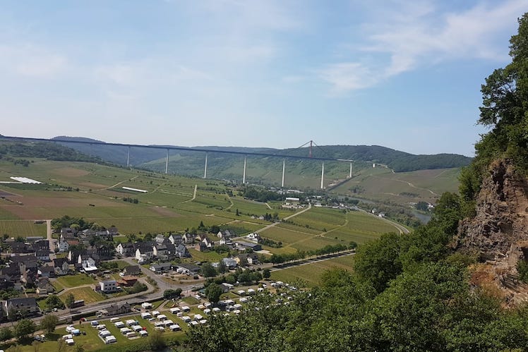 Katharina Prüm of J J Prüm sent a picture that is unfortunately too small to reproduce here but her cousin Erni Loosen replied, 'Please see enclosed photos of the bridge which is nearly finished. There are only one or two segments missing. As far as I have heard, they are having some problems to get the last pillars fixed securely. And that is exactly what the citizens' initiative was always worrying about: the construction team not being able to install the pillars properly and securely in the steep, sliding hill. Anyway, I have heard that they additionally use a lot more concrete to anchor the bridge. So officially they say the whole project will be finished in 2019, but at the end we all don't know.'