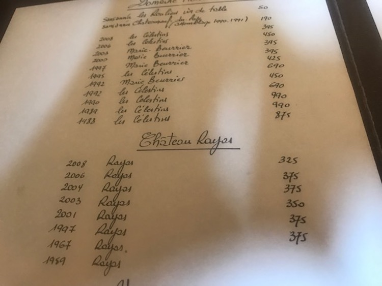 His second point of influence is via his wine list, a passion, a love that he has pursued all his life. The thick, rather battered list – bearing only the words La Beaugravière and La Cave – has long been a treasure trove for any lover of Burgundy, the Rhône and in particular Château Rayas and it sibling Château de Fonsalette. The oldest bottle on the list is a magnum of 1949 from Comte Georges du Vogüé from Jullien’s birth year for €12,000 but most are far, far less expensive. We drank an excellent bottle of 2016 St-Aubin En Remilly from Pierre-Yves Colin-Morey for €85. (See below for a selection of some of the wines, their range in years and their prices.)