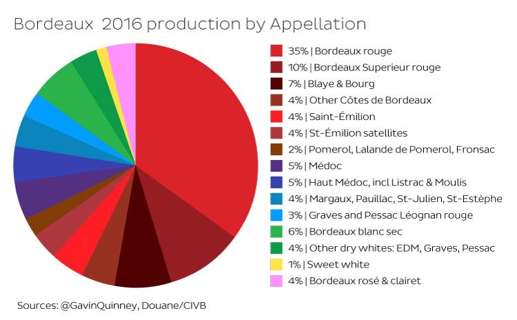 Most, but not all, Bordeaux rouge and Bordeaux Supérieur comes from the Entre-Deux-Mers and the loosely defined ’right bank’. If you know a little of the geography of the region, you'll see that the red and red-toned segments are those of the right bank and the Entre-Deux-Mers, and they’re responsible for two-thirds of the whole output. Merlot, which is widely planted here, saw some spectacular yields in 2016. The Cabernets rather less so.