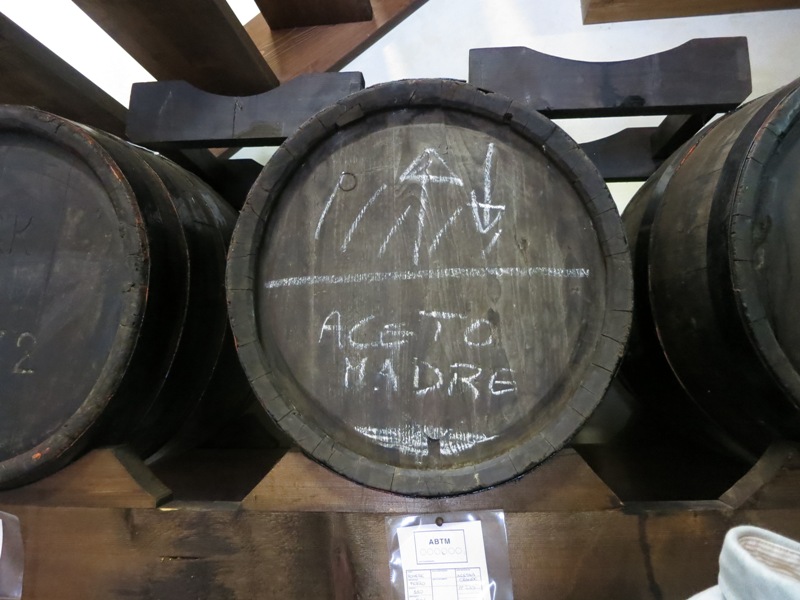 Once they have drawn vinegar off the smallest barrel, two litres from the next barrel up is used to replace the one litre bottled and the one litre evaporated. The process is repeated all the way up until they reach the largest barrel, which is topped up with the new vintage cotto most, solera-like.
