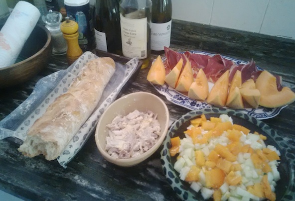 This second image hints at why any local restaurant faces such strong competition – the ingredients round here are so good and so inexpensive. The cucumbers, which really taste as cucumbers should, are €1.50 for three. The melons, succulent and headily ripe, were bought directly from the farm that also sells tomatoes and is located right by a bend in the Canal du Midi so that it catches every one passing by on a boat or a bicycle. They are €5 for three. As an extra, free, service, the lady selling them will put biro marks on each melon to tell you in which order to eat them (0 for today, 1 for tomorrow, 2 for the day after).
