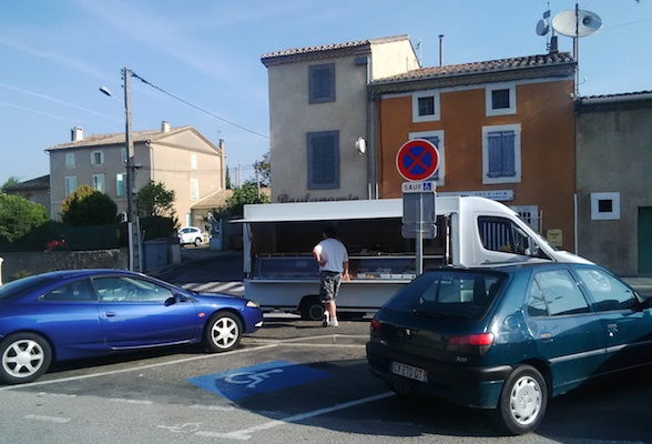 The picture above, taken after our daily foray to the village baker (the boulangerie sign can just be made out behind the travelling meat van), is an amalgam of what everyone believes exists in every French village but is today not often the case at all.