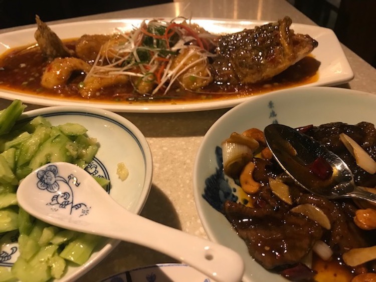 We began with a selection of starters, from mild okra with a ginger sauce, via jelly fish marinated in vinegar, to the spiciest of them all, a dish of ox tongue mixed with tripe. We then chose two soups, of which one, hot and sour tofu soup, was excellent.