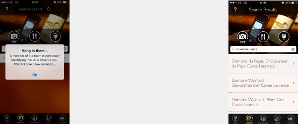 Mercifully, the label recognition technology worked (once you paid for it) – but not brilliantly. It identified half of the labels correctly, offering a range of options for those it couldn’t. As you can see for the left-hand image below, it claims that a person is individually processing the label, but the result of scanning the Weinbach, Cuvée Laurence Gewurztraminer label suggests that it uses automatic text-recognition software instead – which would explain why it offered a Châteauneuf-du-Pape with the same cuvée name.