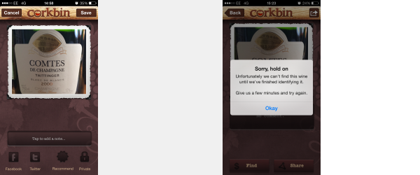 This app is rightfully successful because it handles label recognition much more convincingly than most of the competition. It is quick and intelligent, and it identified all of the wines correctly, although as usual there were certain edits required – usually to correct the vintage. There were a few idiosyncrasies in this regard. For instance, the vintage it suggested for the Comtes de Champagne was 2001, which doesn’t exist.