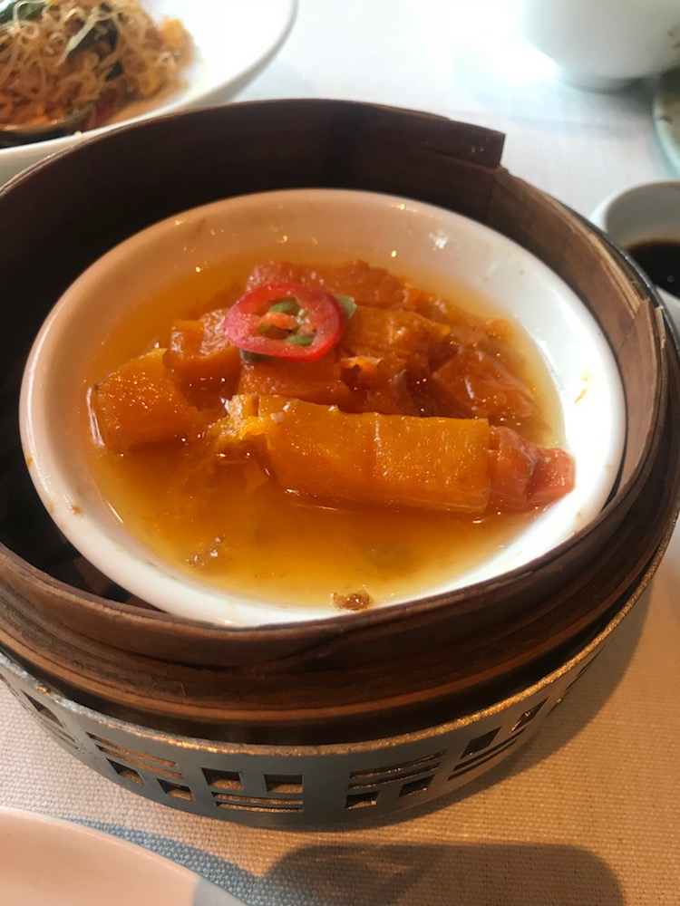The chilies in the sauce of our first course were a portent of things to come. Described as chilled octopus with caviar, of which China is now the world’s largest producer, the sauce was mouth-numbingly hot. Cooler, by far, were their four variations on dim sum that followed.