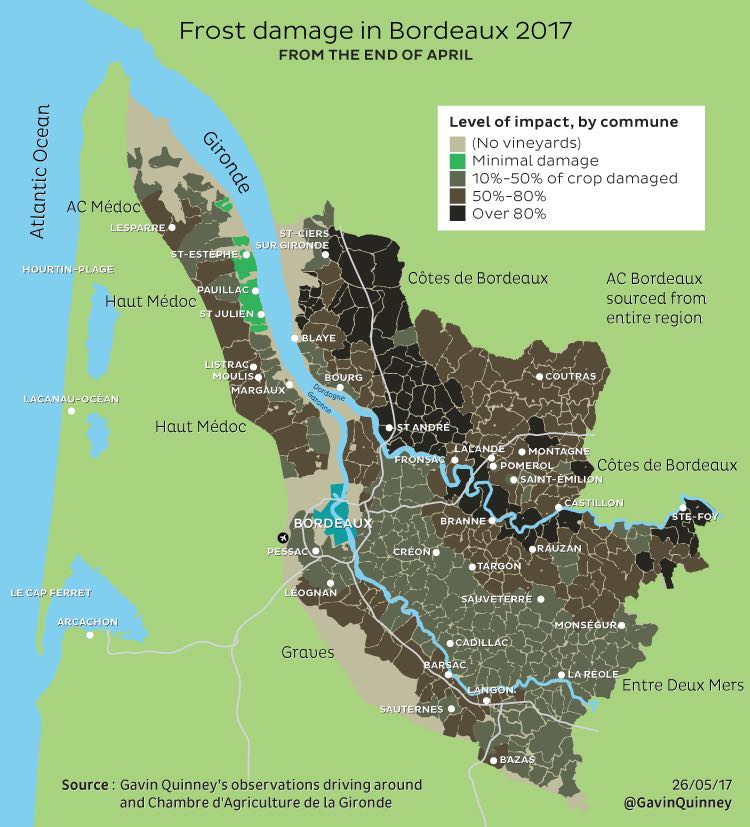 The Entre-Deux-Mers was down 50–100%, Lalande de Pomerol 50–80%, the plain, côtes and sands of St-Émilion 50%, lower Graves 50–80% and Barsac 60–100%. Some areas were spared: the eastern Médoc of river-facing St-Estèphe, Pauillac and St-Julien, but not the western and northern Médoc; the plateau of St-Émilion and Pomerol but not their peripheries; the heights of Sauternes but not Barsac nor the lower reaches of Preignac. The distribution of the frost is shown clearly in Gavin Quinney's map below, taken from his detailed damage-assessment report.