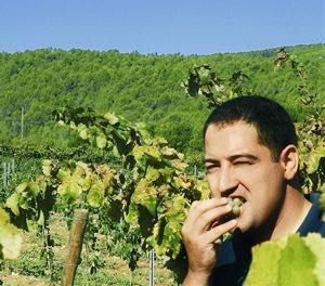 I asked Sergi Colet why he had wanted to make such an unusual, aromatic blend. He replied that 'Muscat is a very typical variety in our area (Mediterranean). We grow Gewürz because my father, Josep Colet, was and remains a man with an open mind, who has traveled extensively to meet other visions of viticulture' so Josep planted the Gewürz on a cooler part of the farm. (Right: Sergi sampling, or perhaps eating, Gewürz in that vineyard.)