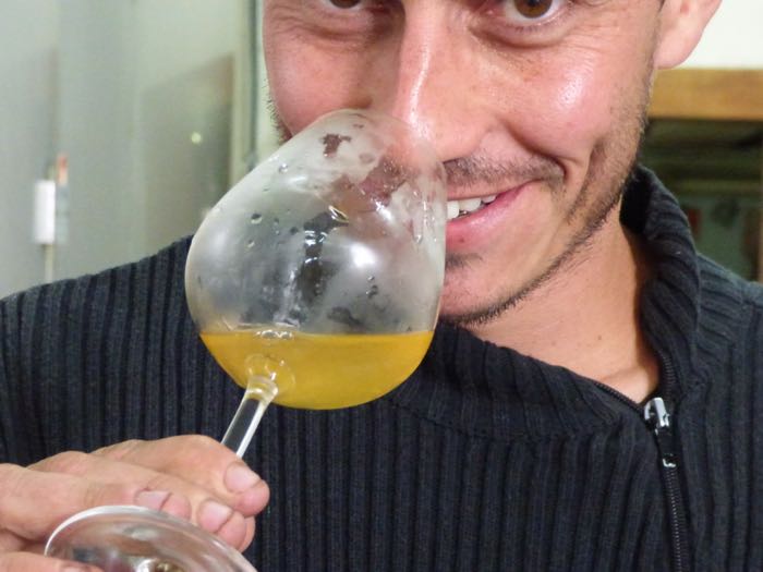 Tasting now, when fermentations are just finishing, your fingers still get sticky. You pour the wine into your glass, and your fingers on the outside get sticky. That’s weird, but hugely gratifying in places such as the Layon, when it means you get to lick your fingers clean. That’s a sort of second innings, a bit like supping beer from your moustache.