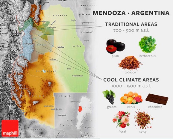 Although they are describing their experiences in the Catena Zapata vineyards, the data are relevant to many producers in Mendoza, especially those with high-elevation sites, from Lunlunta in Maipú (920 m/3,018 ft) up to Gualtallary in the Uco Valley at 1,515 m (4,970 ft). See their illustrated map below to get a much clearer idea of the locations.
