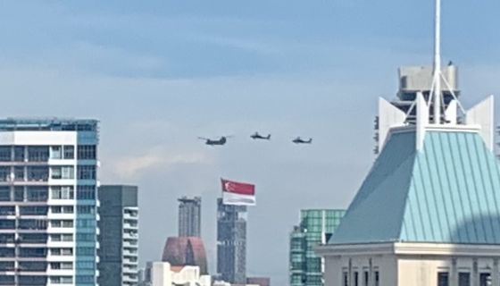 Three years ago this month, the first instalment of my regular Singapore dispatch was published, accompanied by a very similar image to the one you see above. The flag is flown from a military helicopter for Singapore's National Day every August, for which rehearsals take place every Saturday for weeks beforehand.