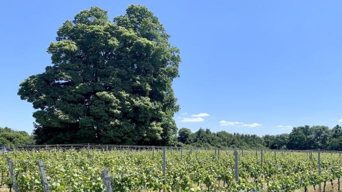 I spy an airborne agricultural well-being barometer; a magnificent, mature red kite soaring high above the massive age-old lime tree (main picture) that dominates the 140m ridge of the perfectly positioned, south facing vineyard slope.