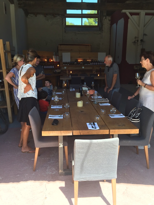 There is in addition a large terrace outside, too hot for anyone to sit at during the day but where aperitifs and food are served as the sun sets on the hills opposite. Large red cast-iron rounds from SAFA, one of Carcassonne’s oldest foundries, grace many of the walls along with numerous items of more commercial intent: packets of Italian pasta, olive oil, Bourdasso T shirts and aprons are for sale. A very fine stage set indeed has been created.