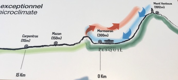 旺度和紧邻其西边的产区吉贡达(Gigondas)以及博姆-德沃尼斯(Beaumes-de-Venise)的最大的区别不是其土壤类型的多样性,而是气候,尤其是昼夜温差,这一点是非常有用的。以当地小镇卡庞特拉(Carpentras)为例,它白天是该地区最炎热的镇子之一,夜晚又是最凉爽的一个,这种昼夜温差延缓了生长期,所以旺度的葡萄藤比教皇新堡的葡萄藤晚发芽,收成期也会晚很多,到十月份才可以采收,采摘的时候,葡萄本身也变得很清凉,并且葡萄的生长期也延长了。